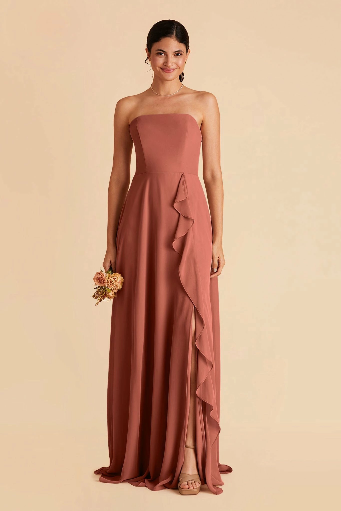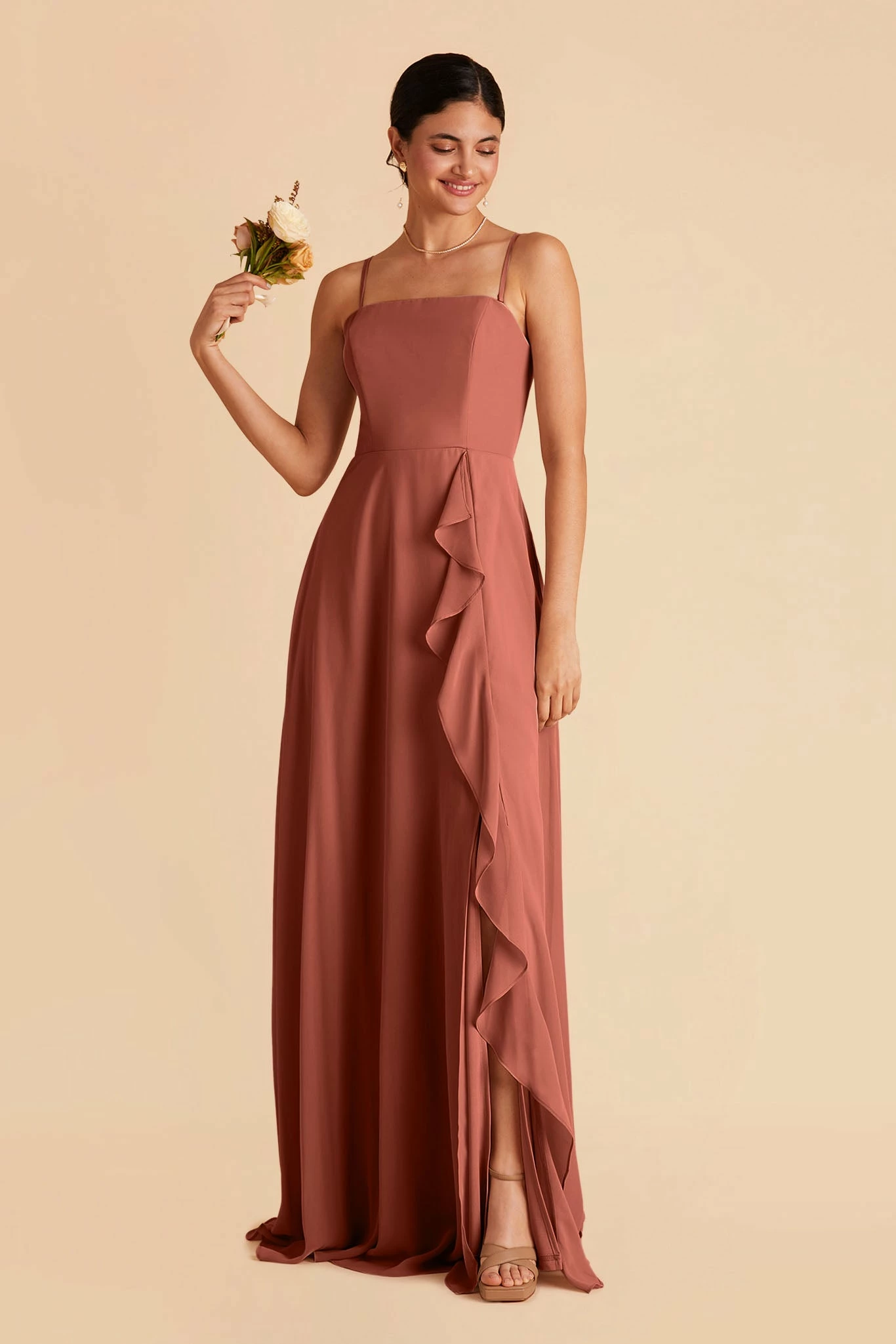 Winnie is like a mashup of our Chris convertible dress and our Theresa ruffle dress. She has a straight neckline, removable spaghetti straps, and a flowy, romantic ruffle skirt. We love this gown with a pretty pearl necklace.