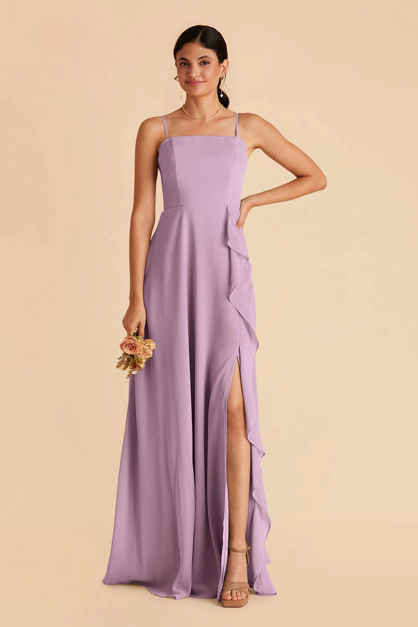 Winnie is like a mashup of our Chris convertible dress and our Theresa ruffle dress. She has a straight neckline, removable spaghetti straps, and a flowy, romantic ruffle skirt. We love this gown with a pretty pearl necklace.